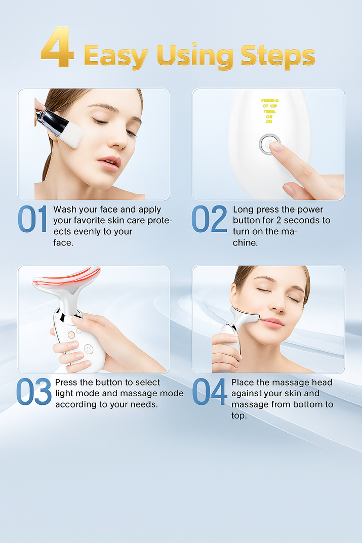 Answer 2: For optimal results, first wash your face and apply serum. Turn on the device and select an LED mode based on your skin concerns. Use the massager in an upward motion on your face, neck, and jawline for 5-10 minutes daily to enhance elasticity and radiance.